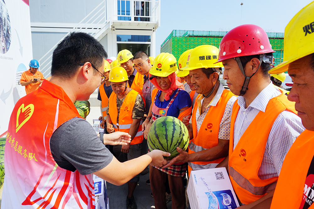 眼下,雖已立秋,但持續(xù)的高溫天氣,讓建設(shè)工地的工人們?nèi)皂斨籽琢胰眨瑩]汗如雨,迎戰(zhàn)“烤”驗。為促進一線工人身心健康,實現(xiàn)工地安全生產(chǎn),8月18日上午,財政監(jiān)管市屬國有企業(yè)“紅色先鋒”黨建聯(lián)盟一行20名黨員代表,來到芝罘灣廣場建設(shè)工地,組織開展了“進工地送清涼”活動,為工人們送上西瓜、礦泉水、藥品等降暑物品,向堅守在高溫下的一線工人送去清涼和關(guān)懷。